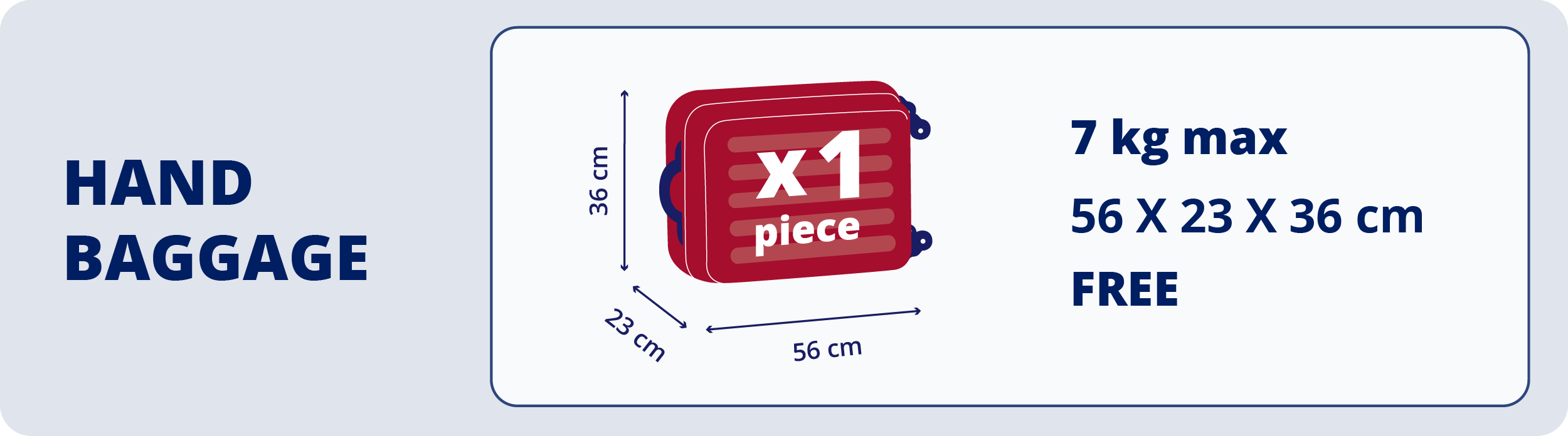 - 1 (one) piece of hand baggage (maximum weight 10 kg) 56x23x36 cm.