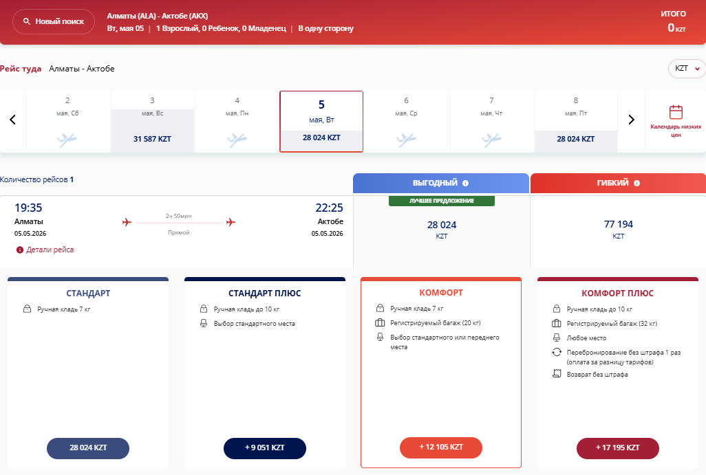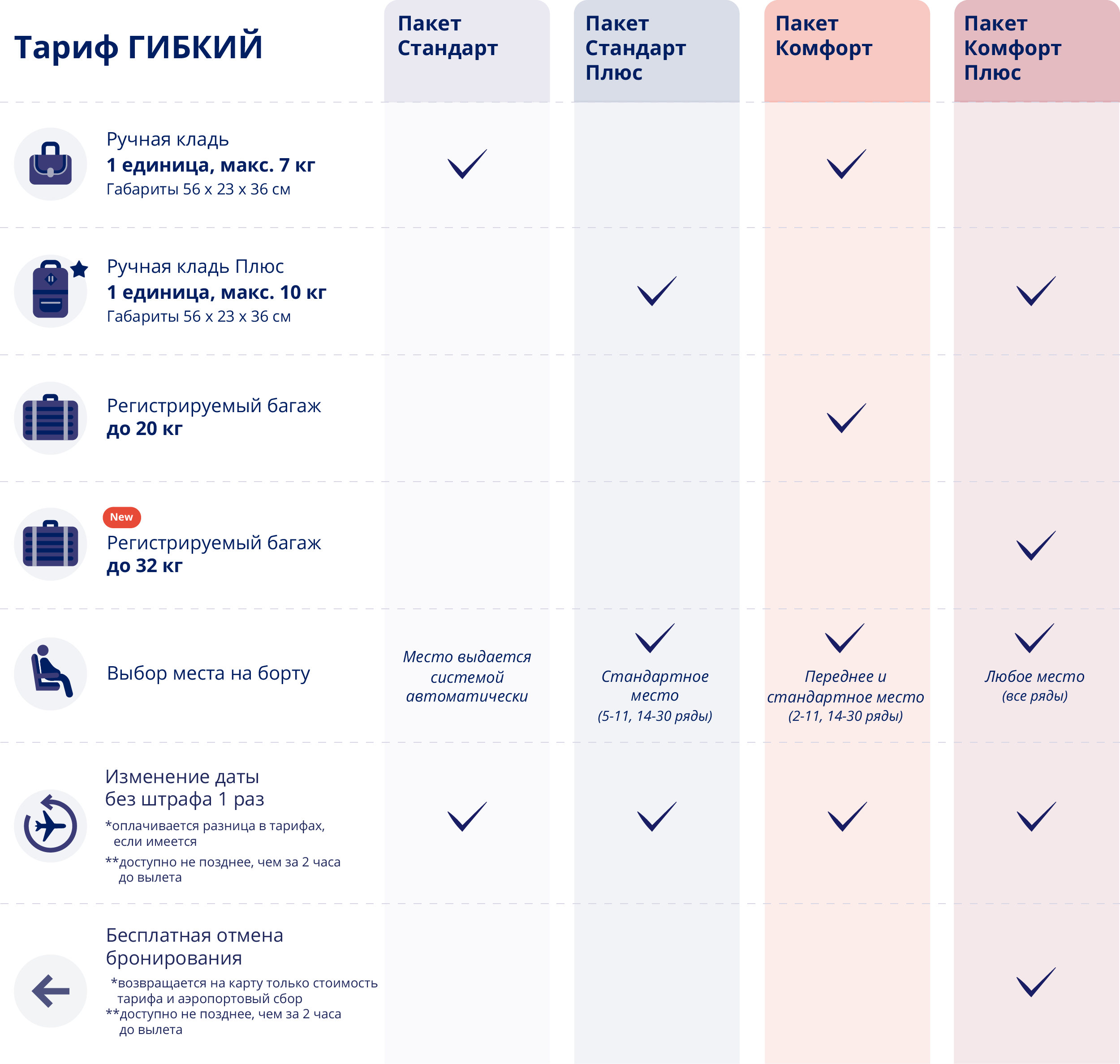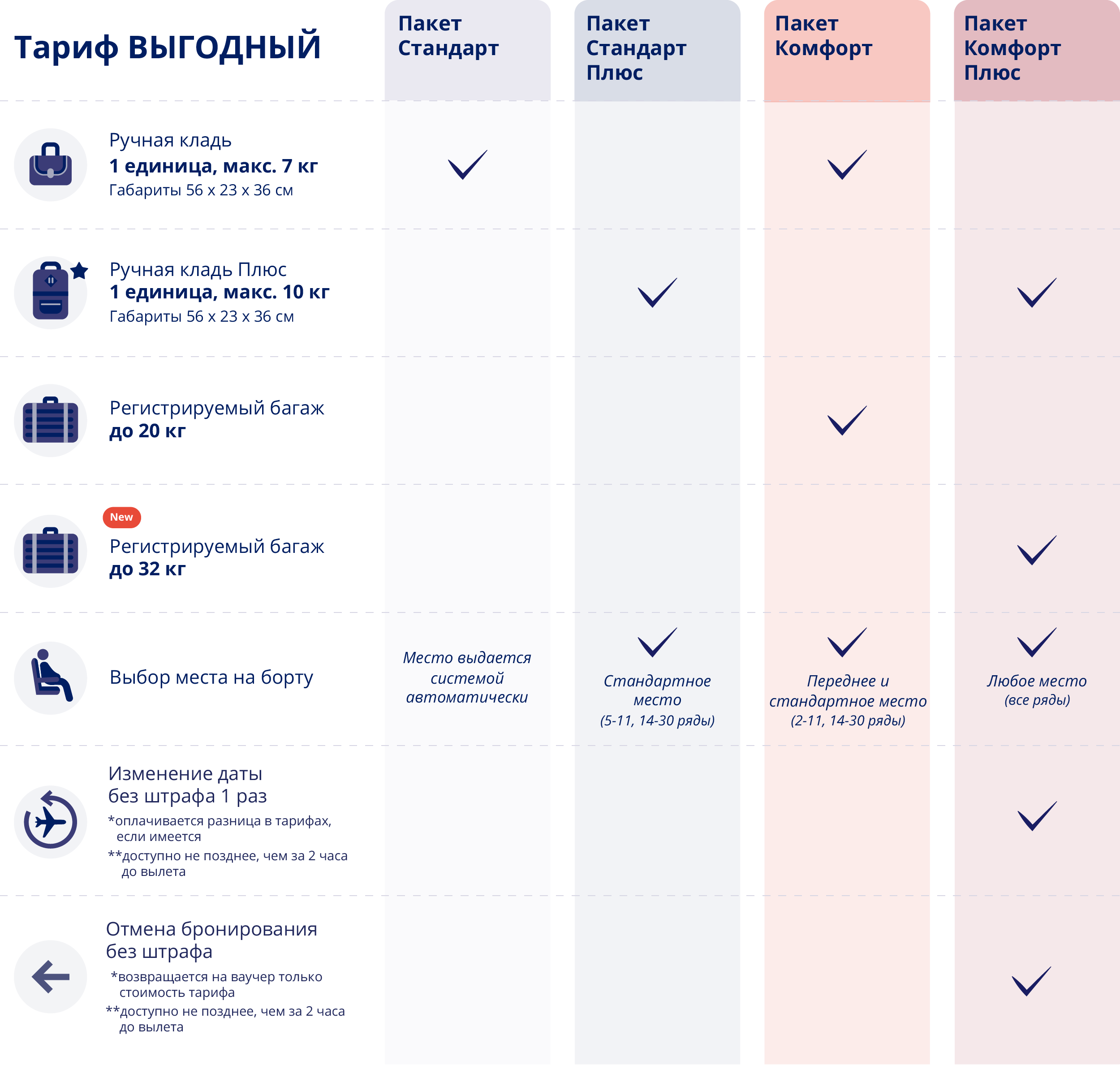 Сэкономьте до 60%! При покупке билета обратите внимание на тарифные пакеты «Комфорт» или «Комфорт Плюс», так можно сразу приобрести билет с багажом до 20 или 32 кг и услугой «выбор места», которая позволит вам самостоятельно выбрать место в желаемом ряду (в зависимости от приобретенного пакета, см. таблицу).